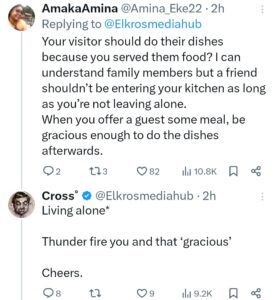 His second point was not well received by many X users and they asked why a guest should be expected to do the dishes after eating.