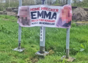 A roadside banner branded a woman a “homewrecker” and even included personal information about the woman.
