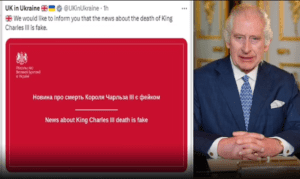 The British Embassy in Kyiv shared an abrupt notice on social media that read: ‘We would like to inform you that the news about the death of King Charles III is fake.’