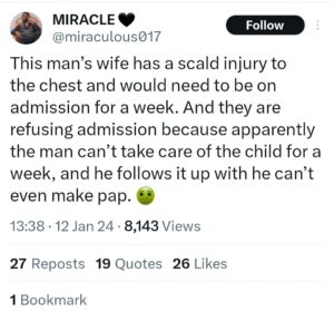 “This man’s wife has a scald injury to the chest and would need to be on admission for a week. And they are refusing admission because apparently, the man can’t take care of the child for a week, and he follows it up with he can’t even make pap.”