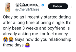 A South African woman, Cheryl, has revealed that her boyfriend is asking her for fuel money three weeks after they started dating.