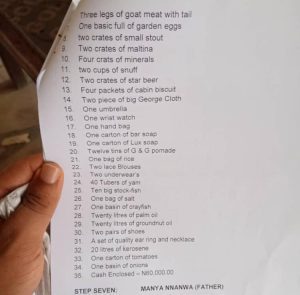 “My brother in-law is getting married to the love of his life who’s from rivers state , he just sent the bride price list to the group and everyone is angry. Wait ! I thought Imo state has the highest list for bride price , what is this list that has 13 steps before someone can marry. Aah aah!!!! Me sef I’m vexing on his behalf, it’s too long and expensive! I cropped some parts because yunno, this thing has step one to thirteen !!! Big big things.”