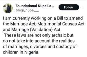 According to the lawyer popularly known as Egi Nupe, the laws are not archaic and do not take into account the realities of marriages, divorces and custody of children in Nigeria.