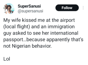 “My wife kissed me at the airport (local flight) and an immigration guy asked to see her international passport…because apparently that’s not Nigerian behavior,” he wrote in a post on Tuesday, March 26.