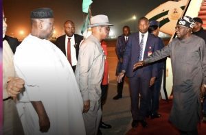 He was received by top government officials, including his Chief of Staff, Femi Gbajabiamila; Secretary to the Government of the Federation, George Akume; National Security Adviser, Nuhu Ribadu and the Minister of the Federal Capital Territory, Nyesom Wike.