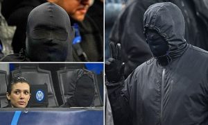 Rapper Kanye West wears a mask covering his entire face as he watches Inter Milan beat Atletico Madrid at the San Siro with wife Bianca and Ty Dolla $ign (Photos)