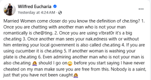 “Married Women come closer do you know the definition of cheating? 1. Once you are chatting with another man who is not your man romantically is che@ting. 2. Once you are using v!brat0r it’s a big che.ating 3. Once another man sees your nak.edness with or without him entering your local government is also called che.ating 4. If you are using cucumber it is che.ating 5. If another woman is washing your plate is che.ating 6. Even admiring another man who is not your man is also che.ating. Should I go on before you start saying I have never cheated on my man make sure you are free from this. Nobody is a saint, just that you have not been caught,” she wrote in a Facebook post on Tuesday.